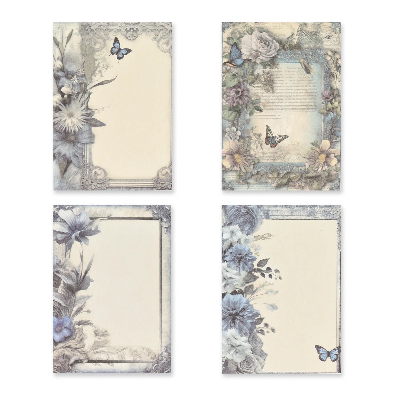 Delicati toni di blu, raffinati motivi floreali e delicate farfalle rendono questo set di carta decorativa un elemento elegante per i tuoi progetti creativi. I raffinati motivi vintage ricordano romantiche scene di giardini e carta da lettere antica, perfetti per junk journal, scrapbook, biglietti di auguri o decorazioni nostalgiche.