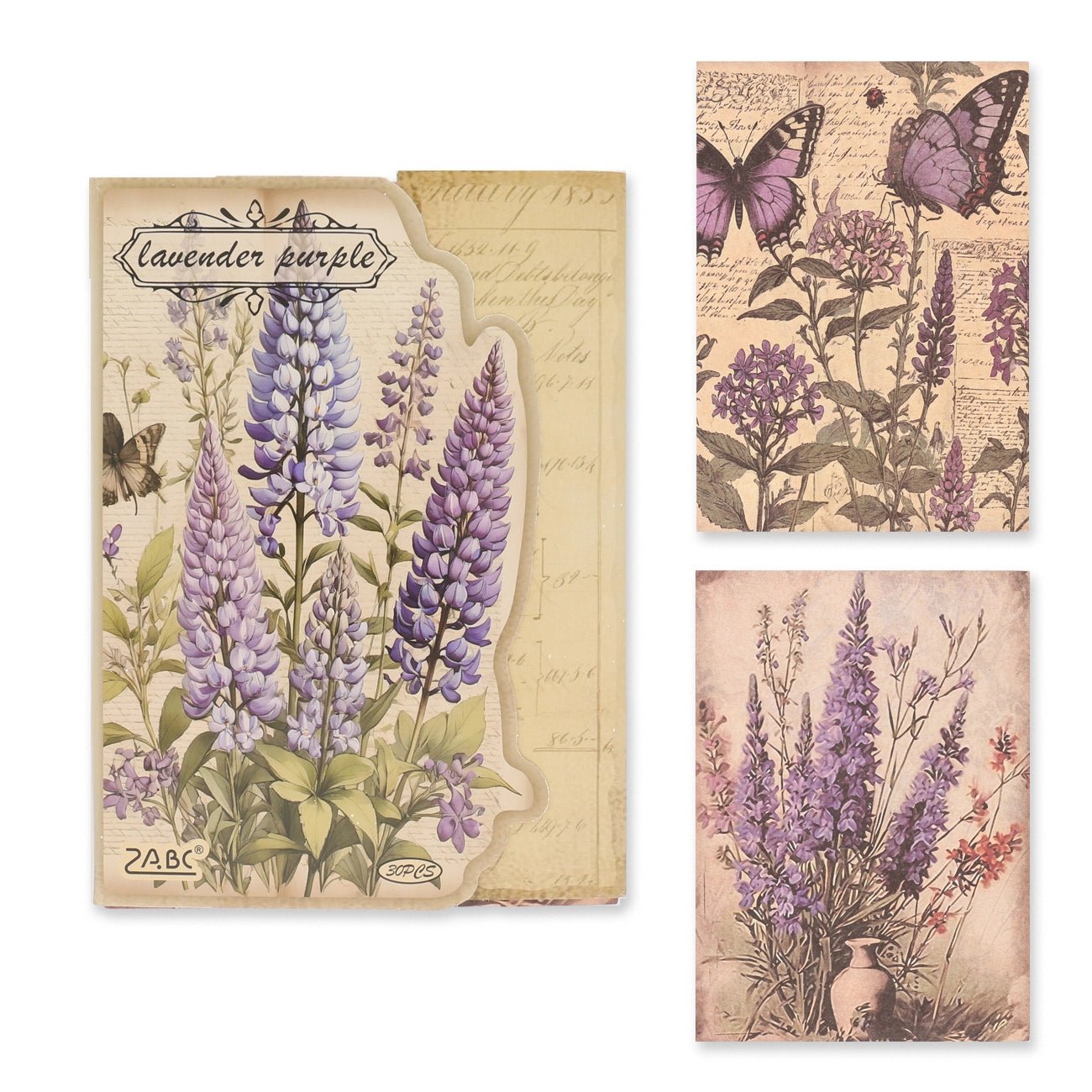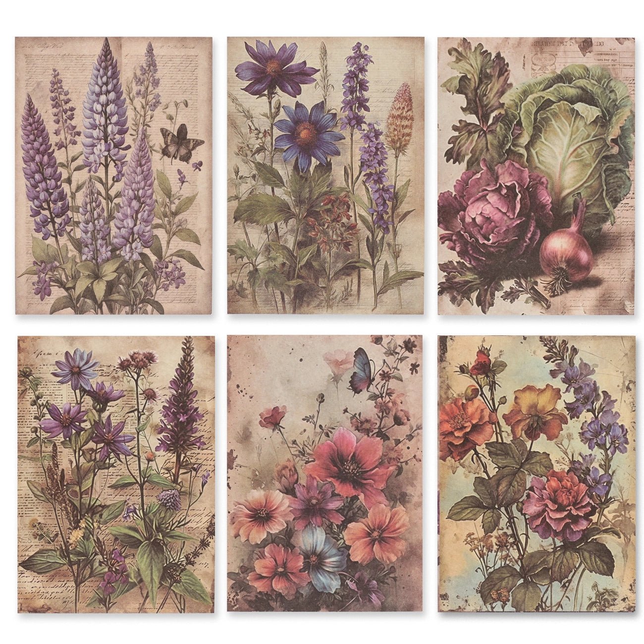 Un profumato saluto floreale dal passato: Lavender Purple incanta con illustrazioni nostalgiche in delicate tonalità di viola, rosa e crema. I motivi botanici ricchi di dettagli con lavanda, lupini, farfalle e vecchie texture di lettere sono ideali per chi ama il romanticismo vintage, perfetti per junk journal, collage, biglietti o opere d'arte botaniche su carta.