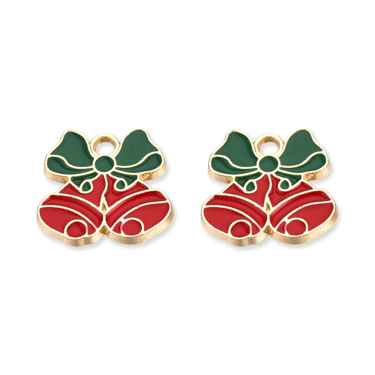 Doppie campanelle festive con fiocco verde: l'elemento decorativo perfetto per le tue creazioni natalizie. Il ciondolo in metallo color oro è impreziosito da smalto rosso e verde e dona immediatamente un tocco festivo a bracciali, collane, orecchini o biglietti regalo. L'occhiello integrato consente un fissaggio rapido e sicuro.